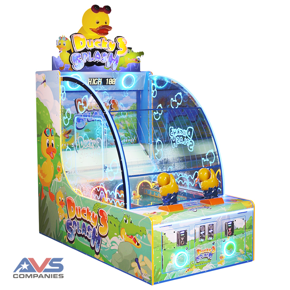 Ducky Splash is an adorable 1-2 players water shooting game designed for kids! Players must shoot as many ducks as possible into their own entrance before the time runs out! Mama Duck gets you more points, whereas the crocodile deducts points. Easy to set up with a captivating 3D duck head marquee… kids will have a blast with this game!